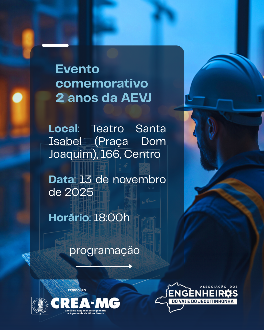 A Associação dos Engenheiros do Vale do Jequitinhonha (AEVJ) realizará seu primeiro evento comemorativo, marcando dois anos de fundação da entidade.